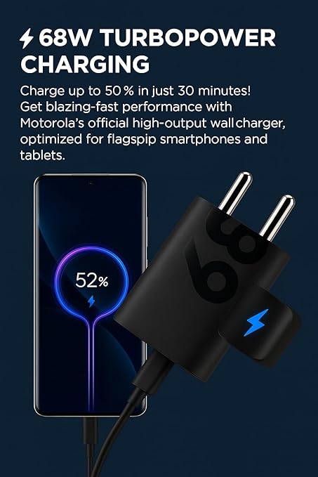 - 💥Motorola Original 68W TurboPower Fast Charger Adapter is engineered for lightning-fast, efficient, and reliable charging. With TurboPower 68W technology and PD 3.0 + Quick Charge 4.0 compatibility, it powers your device safely and up to 50% in just 15 minutes.